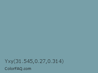 Yxy 31.545,0.27,0.314 Color is a normal cyan color and the nearest color is Gumbo #7ca1a6. Hex code #779fa8 and RGB value is rgb(119,159,168). In RGB color space, this color is composed of 47% red, 62% green, 66% blue, In CMYK color space, this color is composed of 29% cyan, 5% magenta, 0% yellow , 34% black , In HSL color space, this color has a hue angle of 191° , 22% saturation and 56% lightness.