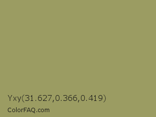 Yxy 31.627,0.366,0.419 Color is a normal yellow color and the nearest color is Moss Green #8a9a5b. Hex code #9b9c62 and RGB value is rgb(155,156,98). In RGB color space, this color is composed of 61% red, 61% green, 38% blue, In CMYK color space, this color is composed of 1% cyan, 0% magenta, 37% yellow , 39% black , In HSL color space, this color has a hue angle of 61° , 23% saturation and 50% lightness.