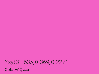 Yxy 31.635,0.369,0.227 Color is a light magenta color and the nearest color is Rose Pink #ff66cc. Hex code #f361c5 and RGB value is rgb(243,97,197). In RGB color space, this color is composed of 95% red, 38% green, 77% blue, In CMYK color space, this color is composed of 0% cyan, 60% magenta, 19% yellow , 5% black , In HSL color space, this color has a hue angle of 319° , 86% saturation and 67% lightness.