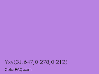 Yxy 31.647,0.278,0.212 Color is a light purple color and the nearest color is Lavender #b57edc. Hex code #b882e2 and RGB value is rgb(184,130,226). In RGB color space, this color is composed of 72% red, 51% green, 89% blue, In CMYK color space, this color is composed of 19% cyan, 42% magenta, 0% yellow , 11% black , In HSL color space, this color has a hue angle of 274° , 62% saturation and 70% lightness.