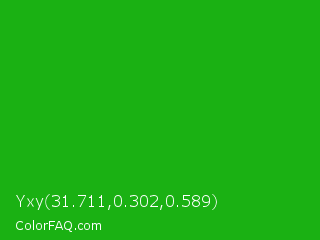 Yxy 31.711,0.302,0.589 Color is a normal green color and the nearest color is Slimy Green #299617. Hex code #1ab113 and RGB value is rgb(26,177,19). In RGB color space, this color is composed of 10% red, 69% green, 7% blue, In CMYK color space, this color is composed of 85% cyan, 0% magenta, 89% yellow , 31% black , In HSL color space, this color has a hue angle of 117° , 81% saturation and 38% lightness.