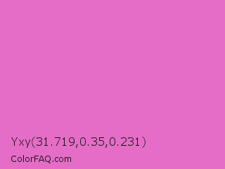 Yxy 31.719,0.35,0.231 Color is a light magenta color and the nearest color is Orchid #da70d6. Hex code #e56dc7 and RGB value is rgb(229,109,199). In RGB color space, this color is composed of 90% red, 43% green, 78% blue, In CMYK color space, this color is composed of 0% cyan, 52% magenta, 13% yellow , 10% black , In HSL color space, this color has a hue angle of 315° , 70% saturation and 66% lightness.
