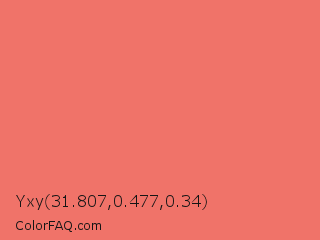 Yxy 31.807,0.477,0.34 Color is a light red color and the nearest color is Coral Reef Hipster Salmon #fd7c6e. Hex code #f07369 and RGB value is rgb(240,115,105). In RGB color space, this color is composed of 94% red, 45% green, 41% blue, In CMYK color space, this color is composed of 0% cyan, 52% magenta, 56% yellow , 6% black , In HSL color space, this color has a hue angle of 4° , 82% saturation and 68% lightness.