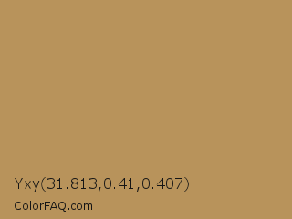 Yxy 31.813,0.41,0.407 Color is a normal orange color and the nearest color is Muddy Waters #b78e5c. Hex code #b8935b and RGB value is rgb(184,147,91). In RGB color space, this color is composed of 72% red, 58% green, 36% blue, In CMYK color space, this color is composed of 0% cyan, 20% magenta, 51% yellow , 28% black , In HSL color space, this color has a hue angle of 36° , 40% saturation and 54% lightness.