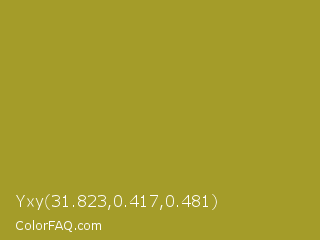 Yxy 31.823,0.417,0.481 Color is a normal yellow color and the nearest color is Lemon Ginger #ac9e22. Hex code #a49c29 and RGB value is rgb(164,156,41). In RGB color space, this color is composed of 64% red, 61% green, 16% blue, In CMYK color space, this color is composed of 0% cyan, 5% magenta, 75% yellow , 36% black , In HSL color space, this color has a hue angle of 56° , 60% saturation and 40% lightness.