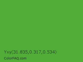 Yxy 31.835,0.317,0.534 Color is a normal green color and the nearest color is Apple #4fa83d. Hex code #4fad38 and RGB value is rgb(79,173,56). In RGB color space, this color is composed of 31% red, 68% green, 22% blue, In CMYK color space, this color is composed of 54% cyan, 0% magenta, 68% yellow , 32% black , In HSL color space, this color has a hue angle of 108° , 51% saturation and 45% lightness.