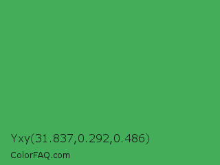 Yxy 31.837,0.292,0.486 Color is a normal green color and the nearest color is Chateau Green #40a860. Hex code #44ad59 and RGB value is rgb(68,173,89). In RGB color space, this color is composed of 27% red, 68% green, 35% blue, In CMYK color space, this color is composed of 61% cyan, 0% magenta, 49% yellow , 32% black , In HSL color space, this color has a hue angle of 132° , 44% saturation and 47% lightness.