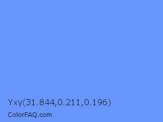 Yxy 31.844,0.211,0.196 Color is a light blue color and the nearest color is Cornflower Blue #6495ed. Hex code #6996fc and RGB value is rgb(105,150,252). In RGB color space, this color is composed of 41% red, 59% green, 99% blue, In CMYK color space, this color is composed of 58% cyan, 40% magenta, 0% yellow , 1% black , In HSL color space, this color has a hue angle of 222° , 96% saturation and 70% lightness.