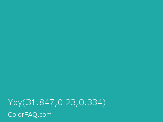 Yxy 31.847,0.23,0.334 Color is a normal cyan color and the nearest color is Light Sea Green #20b2aa. Hex code #1faaa7 and RGB value is rgb(31,170,167). In RGB color space, this color is composed of 12% red, 67% green, 65% blue, In CMYK color space, this color is composed of 82% cyan, 0% magenta, 2% yellow , 33% black , In HSL color space, this color has a hue angle of 179° , 69% saturation and 39% lightness.