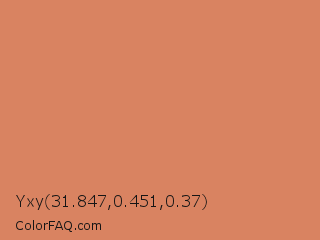 Yxy 31.847,0.451,0.37 Color is a light orange color and the nearest color is Japonica #d87c63. Hex code #d98361 and RGB value is rgb(217,131,97). In RGB color space, this color is composed of 85% red, 51% green, 38% blue, In CMYK color space, this color is composed of 0% cyan, 40% magenta, 55% yellow , 15% black , In HSL color space, this color has a hue angle of 17° , 61% saturation and 62% lightness.