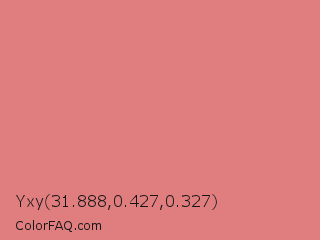Yxy 31.888,0.427,0.327 Color is a light red color and the nearest color is New York Pink #d7837f. Hex code #df7d7f and RGB value is rgb(223,125,127). In RGB color space, this color is composed of 87% red, 49% green, 50% blue, In CMYK color space, this color is composed of 0% cyan, 44% magenta, 43% yellow , 13% black , In HSL color space, this color has a hue angle of 359° , 60% saturation and 68% lightness.