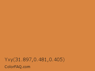 Yxy 31.897,0.481,0.405 Color is a normal orange color and the nearest color is Tigers Eye #e08d3c. Hex code #d98540 and RGB value is rgb(217,133,64). In RGB color space, this color is composed of 85% red, 52% green, 25% blue, In CMYK color space, this color is composed of 0% cyan, 39% magenta, 71% yellow , 15% black , In HSL color space, this color has a hue angle of 27° , 67% saturation and 55% lightness.