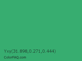 Yxy 31.898,0.271,0.444 Color is a normal green color and the nearest color is Medium Sea Green #3cb371. Hex code #37ad70 and RGB value is rgb(55,173,112). In RGB color space, this color is composed of 22% red, 68% green, 44% blue, In CMYK color space, this color is composed of 68% cyan, 0% magenta, 35% yellow , 32% black , In HSL color space, this color has a hue angle of 149° , 52% saturation and 45% lightness.