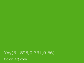 Yxy 31.898,0.331,0.56 Color is a normal green color and the nearest color is Kelly Green #4cbb17. Hex code #54ad1b and RGB value is rgb(84,173,27). In RGB color space, this color is composed of 33% red, 68% green, 11% blue, In CMYK color space, this color is composed of 51% cyan, 0% magenta, 84% yellow , 32% black , In HSL color space, this color has a hue angle of 97° , 73% saturation and 39% lightness.