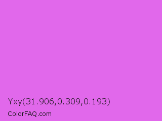 Yxy 31.906,0.309,0.193 Color is a light magenta color and the nearest color is Heliotrope #df73ff. Hex code #e168eb and RGB value is rgb(225,104,235). In RGB color space, this color is composed of 88% red, 41% green, 92% blue, In CMYK color space, this color is composed of 4% cyan, 56% magenta, 0% yellow , 8% black , In HSL color space, this color has a hue angle of 295° , 77% saturation and 66% lightness.