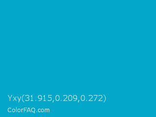 Yxy 31.915,0.209,0.272 Color is a normal cyan color and the nearest color is Cerulean #02a4d3. Hex code #02a7ca and RGB value is rgb(2,167,202). In RGB color space, this color is composed of 1% red, 65% green, 79% blue, In CMYK color space, this color is composed of 99% cyan, 17% magenta, 0% yellow , 21% black , In HSL color space, this color has a hue angle of 191° , 98% saturation and 40% lightness.