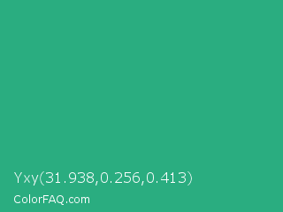 Yxy 31.938,0.256,0.413 Color is a normal green color and the nearest color is Jungle Green #29ab87. Hex code #2aad80 and RGB value is rgb(42,173,128). In RGB color space, this color is composed of 16% red, 68% green, 50% blue, In CMYK color space, this color is composed of 76% cyan, 0% magenta, 26% yellow , 32% black , In HSL color space, this color has a hue angle of 159° , 61% saturation and 42% lightness.
