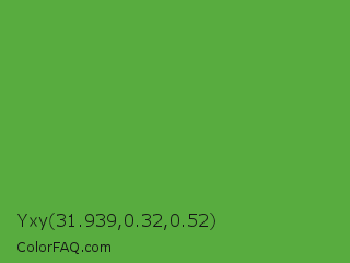 Yxy 31.939,0.32,0.52 Color is a normal green color and the nearest color is Apple #4fa83d. Hex code #58ac3f and RGB value is rgb(88,172,63). In RGB color space, this color is composed of 35% red, 67% green, 25% blue, In CMYK color space, this color is composed of 49% cyan, 0% magenta, 63% yellow , 33% black , In HSL color space, this color has a hue angle of 106° , 46% saturation and 46% lightness.