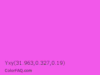 Yxy 31.963,0.327,0.19 Color is a light magenta color and the nearest color is Purple Pizzazz #fe4eda. Hex code #f259ea and RGB value is rgb(242,89,234). In RGB color space, this color is composed of 95% red, 35% green, 92% blue, In CMYK color space, this color is composed of 0% cyan, 63% magenta, 3% yellow , 5% black , In HSL color space, this color has a hue angle of 303° , 85% saturation and 65% lightness.