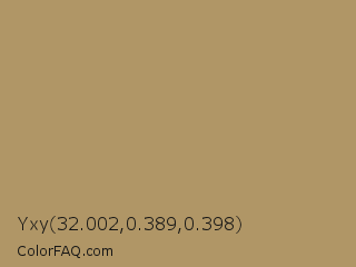 Yxy 32.002,0.389,0.398 Color is a normal orange color and the nearest color is Teak #b19461. Hex code #b09666 and RGB value is rgb(176,150,102). In RGB color space, this color is composed of 69% red, 59% green, 40% blue, In CMYK color space, this color is composed of 0% cyan, 15% magenta, 42% yellow , 31% black , In HSL color space, this color has a hue angle of 39° , 32% saturation and 55% lightness.