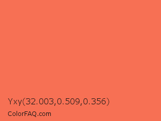 Yxy 32.003,0.509,0.356 Color is a light red color and the nearest color is Persimmon #ff6b53. Hex code #f77054 and RGB value is rgb(247,112,84). In RGB color space, this color is composed of 97% red, 44% green, 33% blue, In CMYK color space, this color is composed of 0% cyan, 55% magenta, 66% yellow , 3% black , In HSL color space, this color has a hue angle of 10° , 91% saturation and 65% lightness.