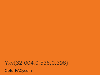 Yxy 32.004,0.536,0.398 Color is a normal orange color and the nearest color is Tango #ed7a1c. Hex code #f17720 and RGB value is rgb(241,119,32). In RGB color space, this color is composed of 95% red, 47% green, 13% blue, In CMYK color space, this color is composed of 0% cyan, 51% magenta, 87% yellow , 5% black , In HSL color space, this color has a hue angle of 25° , 88% saturation and 54% lightness.