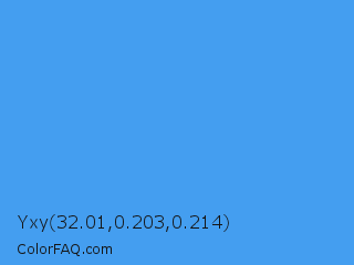 Yxy 32.01,0.203,0.214 Color is a normal blue color and the nearest color is Picton Blue #45b1e8. Hex code #449ef0 and RGB value is rgb(68,158,240). In RGB color space, this color is composed of 27% red, 62% green, 94% blue, In CMYK color space, this color is composed of 72% cyan, 34% magenta, 0% yellow , 6% black , In HSL color space, this color has a hue angle of 209° , 85% saturation and 60% lightness.