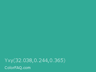 Yxy 32.038,0.244,0.365 Color is a normal cyan color and the nearest color is Keppel #3ab09e. Hex code #31ab97 and RGB value is rgb(49,171,151). In RGB color space, this color is composed of 19% red, 67% green, 59% blue, In CMYK color space, this color is composed of 71% cyan, 0% magenta, 12% yellow , 33% black , In HSL color space, this color has a hue angle of 170° , 55% saturation and 43% lightness.