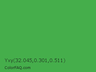 Yxy 32.045,0.301,0.511 Color is a normal green color and the nearest color is Apple #4fa83d. Hex code #45ae4b and RGB value is rgb(69,174,75). In RGB color space, this color is composed of 27% red, 68% green, 29% blue, In CMYK color space, this color is composed of 60% cyan, 0% magenta, 57% yellow , 32% black , In HSL color space, this color has a hue angle of 123° , 43% saturation and 48% lightness.