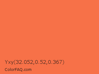 Yxy 32.052,0.52,0.367 Color is a light red color and the nearest color is Outrageous Orange #ff6e4a. Hex code #f77148 and RGB value is rgb(247,113,72). In RGB color space, this color is composed of 97% red, 44% green, 28% blue, In CMYK color space, this color is composed of 0% cyan, 54% magenta, 71% yellow , 3% black , In HSL color space, this color has a hue angle of 14° , 92% saturation and 63% lightness.