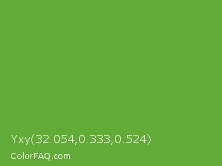 Yxy 32.054,0.333,0.524 Color is a normal green color and the nearest color is Green RYB #66b032. Hex code #63ab37 and RGB value is rgb(99,171,55). In RGB color space, this color is composed of 39% red, 67% green, 22% blue, In CMYK color space, this color is composed of 42% cyan, 0% magenta, 68% yellow , 33% black , In HSL color space, this color has a hue angle of 97° , 51% saturation and 44% lightness.