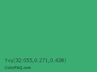 Yxy 32.055,0.271,0.438 Color is a normal green color and the nearest color is Medium Sea Green #3cb371. Hex code #3bad73 and RGB value is rgb(59,173,115). In RGB color space, this color is composed of 23% red, 68% green, 45% blue, In CMYK color space, this color is composed of 66% cyan, 0% magenta, 34% yellow , 32% black , In HSL color space, this color has a hue angle of 149° , 49% saturation and 45% lightness.
