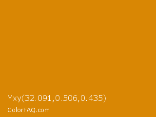 Yxy 32.091,0.506,0.435 Color is a normal orange color and the nearest color is Harvest Gold #da9100. Hex code #d98704 and RGB value is rgb(217,135,4). In RGB color space, this color is composed of 85% red, 53% green, 2% blue, In CMYK color space, this color is composed of 0% cyan, 38% magenta, 98% yellow , 15% black , In HSL color space, this color has a hue angle of 37° , 96% saturation and 43% lightness.