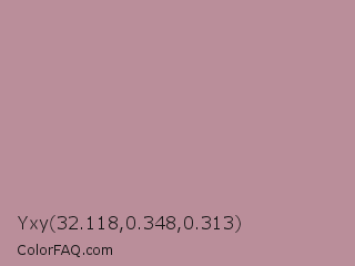 Yxy 32.118,0.348,0.313 Color is a light rose color and the nearest color is Rosy Brown #bc8f8f. Hex code #ba8e9a and RGB value is rgb(186,142,154). In RGB color space, this color is composed of 73% red, 56% green, 60% blue, In CMYK color space, this color is composed of 0% cyan, 24% magenta, 17% yellow , 27% black , In HSL color space, this color has a hue angle of 344° , 24% saturation and 64% lightness.