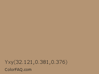 Yxy 32.121,0.381,0.376 Color is a normal orange color and the nearest color is Light Taupe #b38b6d. Hex code #b49473 and RGB value is rgb(180,148,115). In RGB color space, this color is composed of 71% red, 58% green, 45% blue, In CMYK color space, this color is composed of 0% cyan, 18% magenta, 36% yellow , 29% black , In HSL color space, this color has a hue angle of 30° , 30% saturation and 58% lightness.