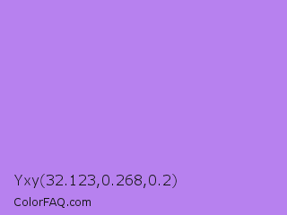 Yxy 32.123,0.268,0.2 Color is a light violet color and the nearest color is Lavender #b57edc. Hex code #b781ef and RGB value is rgb(183,129,239). In RGB color space, this color is composed of 72% red, 51% green, 94% blue, In CMYK color space, this color is composed of 23% cyan, 46% magenta, 0% yellow , 6% black , In HSL color space, this color has a hue angle of 269° , 77% saturation and 72% lightness.