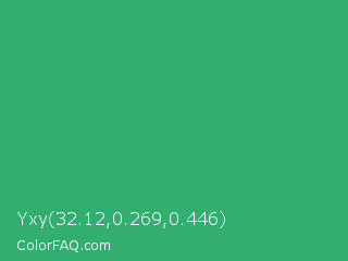 Yxy 32.12,0.269,0.446 Color is a normal green color and the nearest color is Medium Sea Green #3cb371. Hex code #32ae70 and RGB value is rgb(50,174,112). In RGB color space, this color is composed of 20% red, 68% green, 44% blue, In CMYK color space, this color is composed of 71% cyan, 0% magenta, 36% yellow , 32% black , In HSL color space, this color has a hue angle of 150° , 55% saturation and 44% lightness.