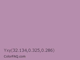 Yxy 32.134,0.325,0.286 Color is a light magenta color and the nearest color is Opera Mauve #b784a7. Hex code #b78dad and RGB value is rgb(183,141,173). In RGB color space, this color is composed of 72% red, 55% green, 68% blue, In CMYK color space, this color is composed of 0% cyan, 23% magenta, 5% yellow , 28% black , In HSL color space, this color has a hue angle of 314° , 23% saturation and 64% lightness.