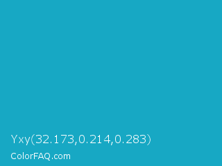 Yxy 32.173,0.214,0.283 Color is a normal cyan color and the nearest color is Pacific Blue #1ca9c9. Hex code #17a8c4 and RGB value is rgb(23,168,196). In RGB color space, this color is composed of 9% red, 66% green, 77% blue, In CMYK color space, this color is composed of 88% cyan, 14% magenta, 0% yellow , 23% black , In HSL color space, this color has a hue angle of 190° , 79% saturation and 43% lightness.
