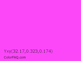 Yxy 32.17,0.323,0.174 Color is a light magenta color and the nearest color is Pink Flamingo Crayola #ff66ff. Hex code #fc47f9 and RGB value is rgb(252,71,249). In RGB color space, this color is composed of 99% red, 28% green, 98% blue, In CMYK color space, this color is composed of 0% cyan, 72% magenta, 1% yellow , 1% black , In HSL color space, this color has a hue angle of 301° , 97% saturation and 63% lightness.