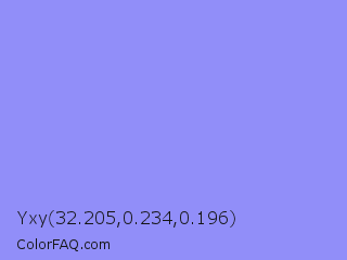 Yxy 32.205,0.234,0.196 Color is a light indigo color and the nearest color is Portage #8b9fee. Hex code #918ef9 and RGB value is rgb(145,142,249). In RGB color space, this color is composed of 57% red, 56% green, 98% blue, In CMYK color space, this color is composed of 42% cyan, 43% magenta, 0% yellow , 2% black , In HSL color space, this color has a hue angle of 242° , 90% saturation and 77% lightness.