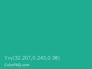 Yxy 32.207,0.243,0.38 Color is a normal cyan color and the nearest color is Mountain Meadow Crayola #1ab385. Hex code #1ead91 and RGB value is rgb(30,173,145). In RGB color space, this color is composed of 12% red, 68% green, 57% blue, In CMYK color space, this color is composed of 83% cyan, 0% magenta, 16% yellow , 32% black , In HSL color space, this color has a hue angle of 168° , 70% saturation and 40% lightness.