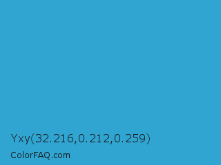 Yxy 32.216,0.212,0.259 Color is a normal blue color and the nearest color is Ball Blue #21abcd. Hex code #31a5d2 and RGB value is rgb(49,165,210). In RGB color space, this color is composed of 19% red, 65% green, 82% blue, In CMYK color space, this color is composed of 77% cyan, 21% magenta, 0% yellow , 18% black , In HSL color space, this color has a hue angle of 197° , 64% saturation and 51% lightness.