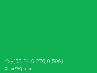Yxy 32.21,0.276,0.506 Color is a normal green color and the nearest color is Green Pigment #00a550. Hex code #10b155 and RGB value is rgb(16,177,85). In RGB color space, this color is composed of 6% red, 69% green, 33% blue, In CMYK color space, this color is composed of 91% cyan, 0% magenta, 52% yellow , 31% black , In HSL color space, this color has a hue angle of 146° , 83% saturation and 38% lightness.