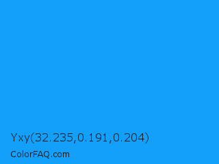 Yxy 32.235,0.191,0.204 Color is a normal blue color and the nearest color is Dodger Blue #1e90ff. Hex code #12a0fb and RGB value is rgb(18,160,251). In RGB color space, this color is composed of 7% red, 63% green, 98% blue, In CMYK color space, this color is composed of 93% cyan, 36% magenta, 0% yellow , 2% black , In HSL color space, this color has a hue angle of 203° , 97% saturation and 53% lightness.