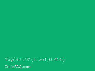 Yxy 32.235,0.261,0.456 Color is a normal green color and the nearest color is Jade #00a86b. Hex code #09b06e and RGB value is rgb(9,176,110). In RGB color space, this color is composed of 4% red, 69% green, 43% blue, In CMYK color space, this color is composed of 95% cyan, 0% magenta, 38% yellow , 31% black , In HSL color space, this color has a hue angle of 156° , 90% saturation and 36% lightness.