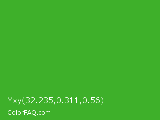 Yxy 32.235,0.311,0.56 Color is a normal green color and the nearest color is Wageningen Green #34b233. Hex code #3eb02a and RGB value is rgb(62,176,42). In RGB color space, this color is composed of 24% red, 69% green, 16% blue, In CMYK color space, this color is composed of 65% cyan, 0% magenta, 76% yellow , 31% black , In HSL color space, this color has a hue angle of 111° , 61% saturation and 43% lightness.