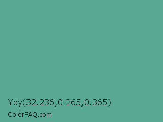 Yxy 32.236,0.265,0.365 Color is a normal cyan color and the nearest color is Polished Pine #5da493. Hex code #59a893 and RGB value is rgb(89,168,147). In RGB color space, this color is composed of 35% red, 66% green, 58% blue, In CMYK color space, this color is composed of 47% cyan, 0% magenta, 13% yellow , 34% black , In HSL color space, this color has a hue angle of 164° , 31% saturation and 50% lightness.