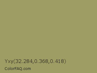 Yxy 32.284,0.368,0.418 Color is a normal yellow color and the nearest color is Teak #b19461. Hex code #9e9d63 and RGB value is rgb(158,157,99). In RGB color space, this color is composed of 62% red, 62% green, 39% blue, In CMYK color space, this color is composed of 0% cyan, 1% magenta, 37% yellow , 38% black , In HSL color space, this color has a hue angle of 59° , 23% saturation and 50% lightness.