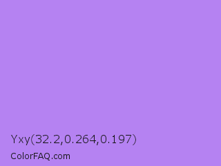 Yxy 32.2,0.264,0.197 Color is a light violet color and the nearest color is Lavender #b57edc. Hex code #b582f2 and RGB value is rgb(181,130,242). In RGB color space, this color is composed of 71% red, 51% green, 95% blue, In CMYK color space, this color is composed of 25% cyan, 46% magenta, 0% yellow , 5% black , In HSL color space, this color has a hue angle of 267° , 81% saturation and 73% lightness.